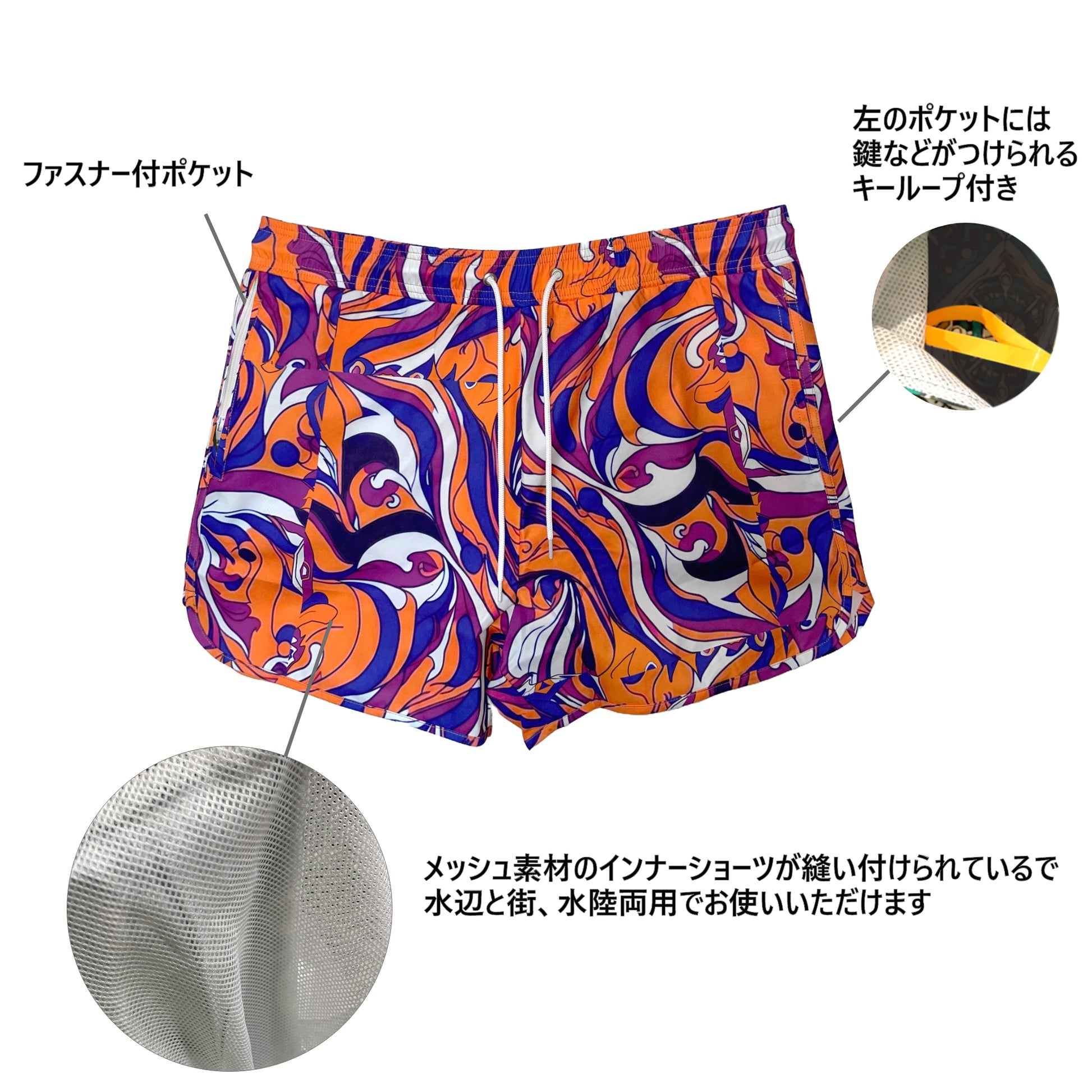 R-3は、南国の夕焼けを思わせるオレンジの色合いと、計算された絶妙な配色が魅力です。自然に溶け込みながらも存在感を放つこのエスニックなデザインは、他と差がつく大人のサーフパンツとなっており、夏のワードローブにぜひ加えたい一着です。